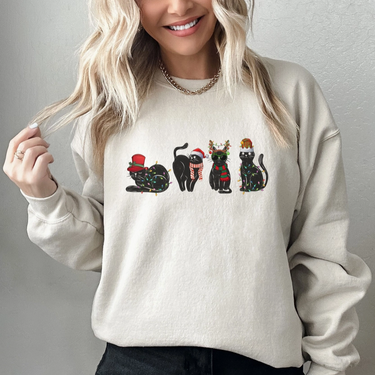 Get into the holiday spirit with a little help from four mischievous cats! This cozy Cat Christmas Sweater features a playful design of four black cats tangled in Christmas lights and dressed in festive outfits—because what’s Christmas without a little feline chaos?