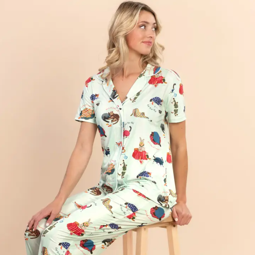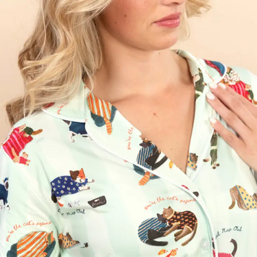This classic button-down features a sophisticated notched collar, short sleeves, and contrast piping for a polished look—even if you just rolled out of bed. Made from a lightweight, butter-soft fabric, it offers a relaxed fit that’s perfect for morning coffee, late-night reading, or just ignoring your alarm clock. The whimsical print showcases our favorite napping experts, reminding everyone that a little rest goes a long way.