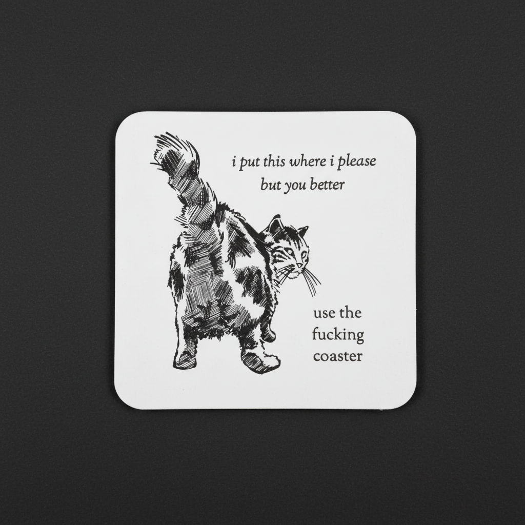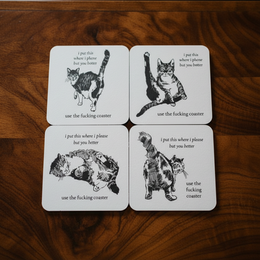 Protect your surfaces with a side of sass. These coasters feature 4 unique illustrations of cats in their most unapologetic, "if I fits, I sits" poses. They don't respect your personal space, and they definitely don't respect your coffee table—but they'll help you make sure your guests do.