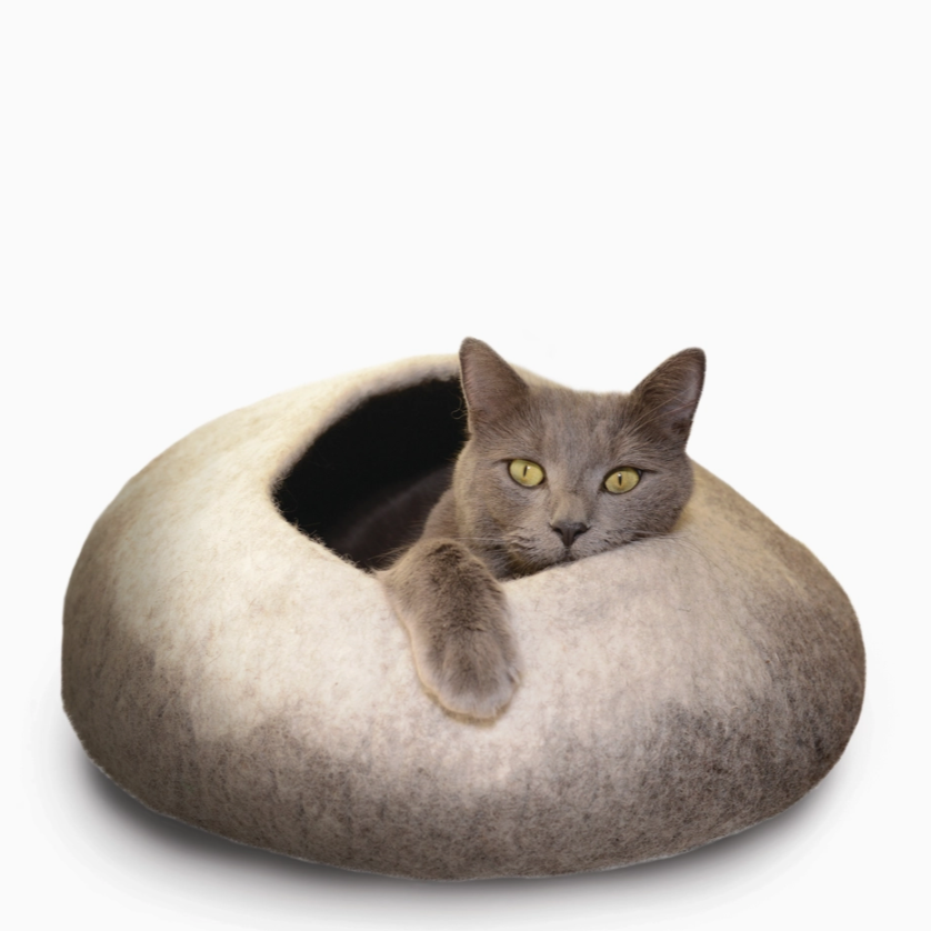 Introducing the Ombre Wool Cat Cave: because every cat deserves a throne, even if it's underground! Made from a magical blend of Nepalese and New Zealand wool, this round cave takes your kitty from "meh" to "majestic" with its ombre transition from cloud white to midnight gray. It's not just a bed; it's a VIP lounge where your furball can plot world domination or take a well-deserved catnap. Plus, with lanolin-infused goodness, it's like a spa day for their paws and fur! Say hello to the ultimate hideout that'll have your cat purring with pleasure! 🐾