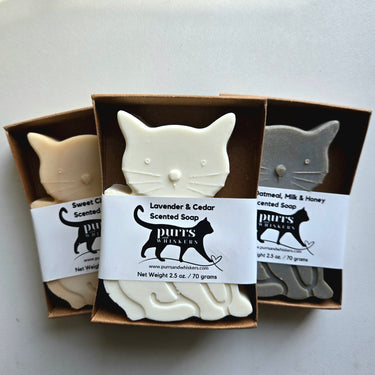 Treat yourself to the purr-fect SPA-like experience with this handmade cat shaped hand soap! Available in oatmeal, milk and honey, sweet citrus, peppermint and lavander & cedar, this soothing cat shaped bath soap will turn your bathroom into a luxurious oasis. It also makes a funny cat themed gift or stocking stuffer for a cat lover and is suitable for any occasion - from birthdays and holidays to sweet surprises and housewarming gifts. Pick one or mix and match the unique scents and add unique purr-sonality to your everyday essentials!