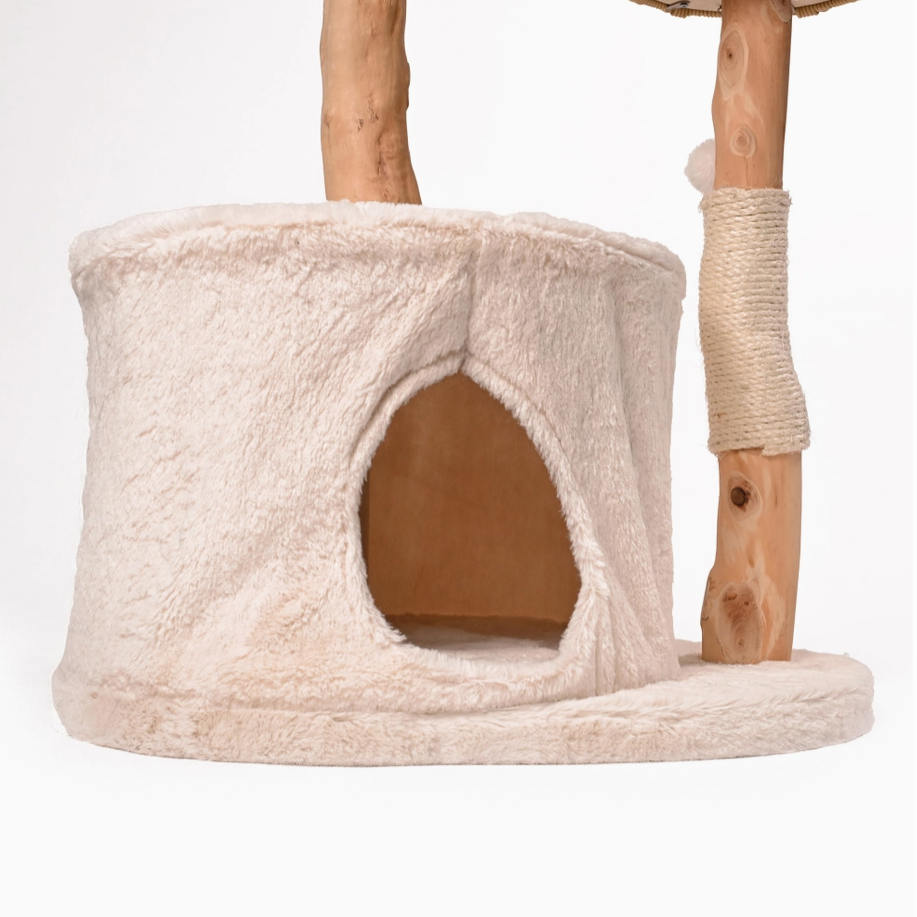 Natural Materials, Expert Craftsmanship Constructed from authentic natural wood branches and accented with high-quality sisal rope for those necessary scratch sessions, each tower is a one-of-a-kind masterpiece. The two elevated hand-woven wicker baskets offer a breezy, bohemian vibe and come with ultra-plush cushions—perfect for bird watching or a long afternoon nap.