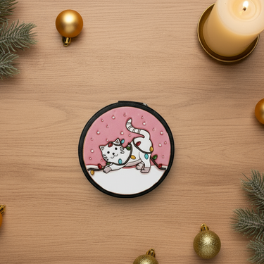 • Festive Design: Adorable white cat tangled in Christmas lights on a light pink snowy background, adding a touch of holiday cheer to your jewelry collection.