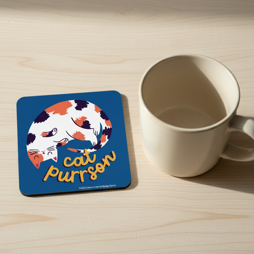Show off your feline pride with our cozy and colorful Cat Purrson Coaster! This 4" x 4" coaster features a napping calico cat curled up against a blue background, with the words "Cat Purrson" printed in bold yellow lettering. Whether you're sipping coffee or tea, this coaster is a must-have for anyone who identifies as part of the cat-loving crowd.