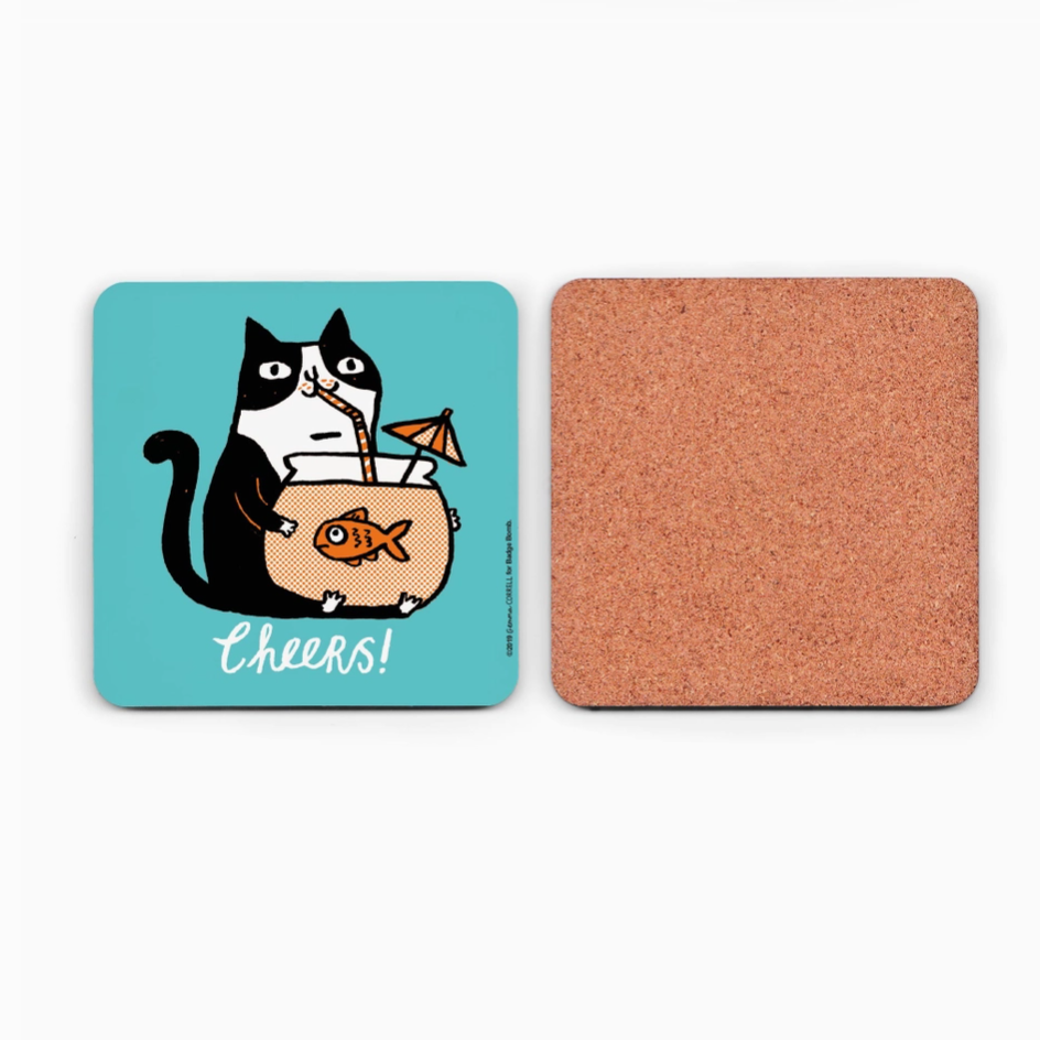 Designed by Gemma Correll, this coaster features a very focused cat sipping directly from a fishbowl—complete with a tiny cocktail umbrella and a very concerned-looking goldfish. It’s the perfect blend of quirky art and practical protection for your furniture.