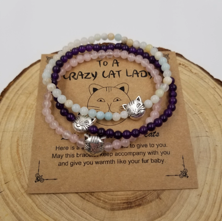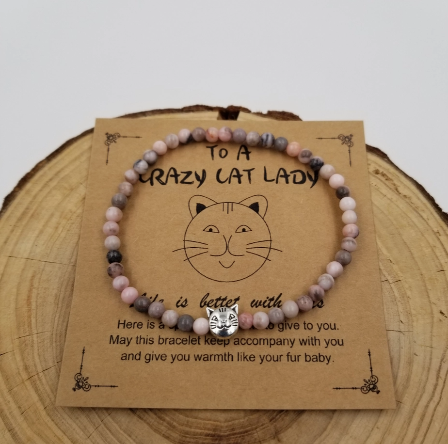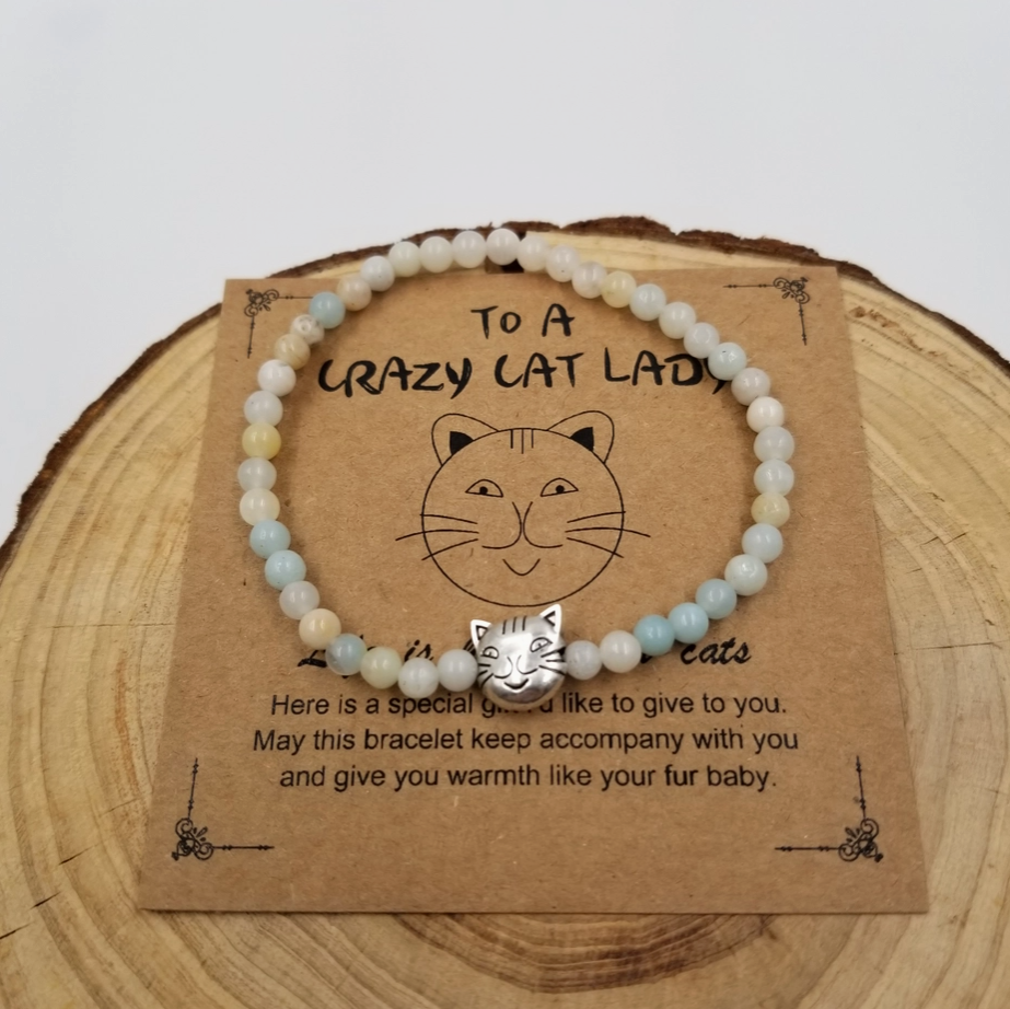 Wear your "Crazy Cat Lady" title as a badge of honor with our stunning Cat Charm Bracelet. This delicate and meaningful piece is handcrafted with 4mm natural crystals, offering a touch of earthy elegance to your everyday look. Each bracelet features a charming, detailed silver-tone cat face charm that serves as a sweet reminder of your favorite fur baby.