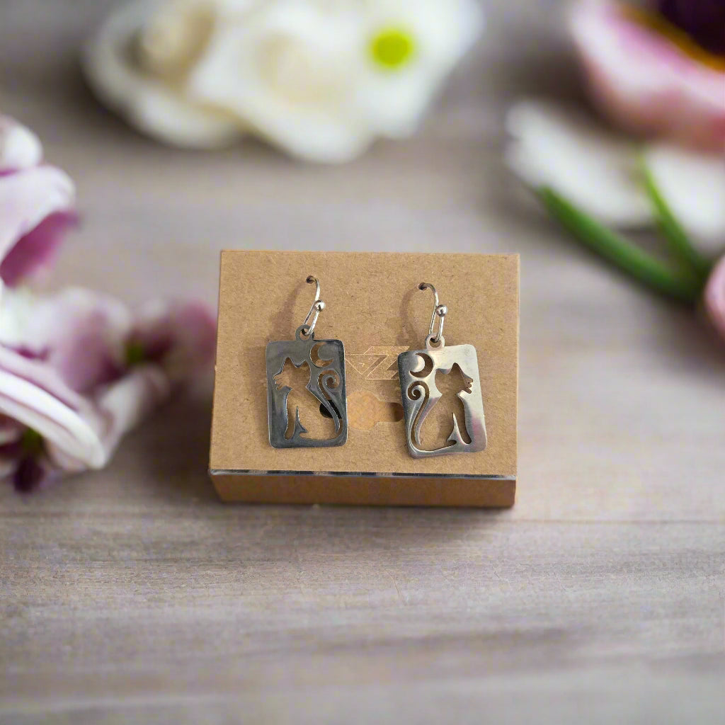 Embrace the beauty of the night sky with these stunning Mooney Cat Earrings. These unique silver-tone rectangular drop earrings feature a cut-out silhouette of a cat with a crescent moon, along with the cat’s tail flowing beautifully around the moon. The design is both whimsical and elegant, capturing the magic of the night and the mystery of the feline spirit. These earrings are perfect for cat lovers who appreciate celestial themes and want to add a bit of magic to their accessory collection.