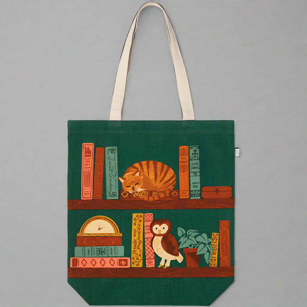 For bookworms and cat lovers alike, our Book Club Cat Tote is the purr-fect everyday companion. This cozy design features an orange tabby cat napping atop a bookshelf, surrounded by books, against a calming green backdrop with earthy tones. It’s basically the tote version of curling up with a good read (minus the cat hair).