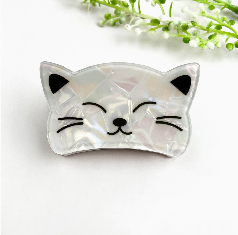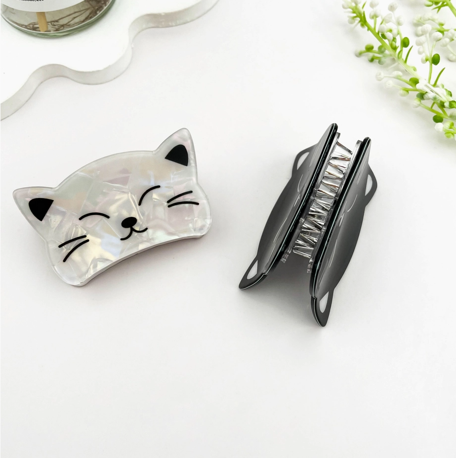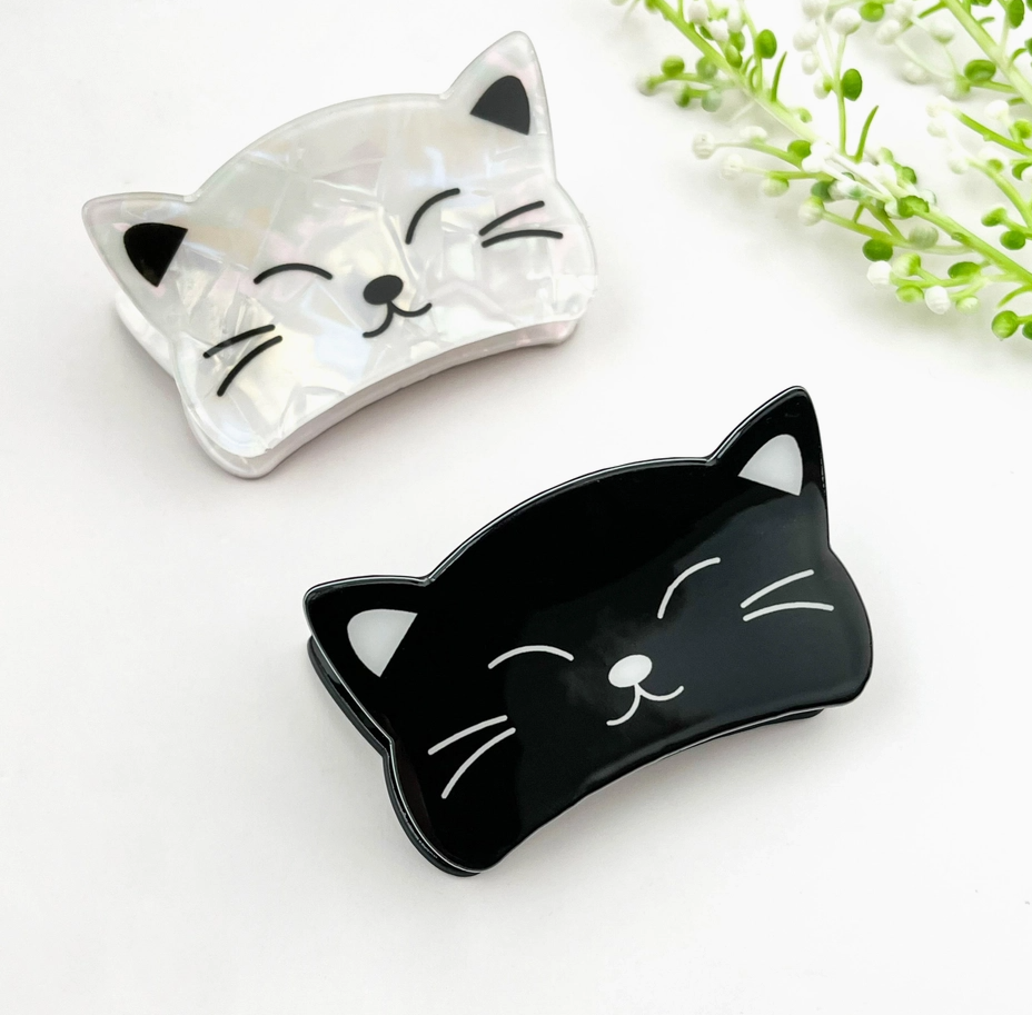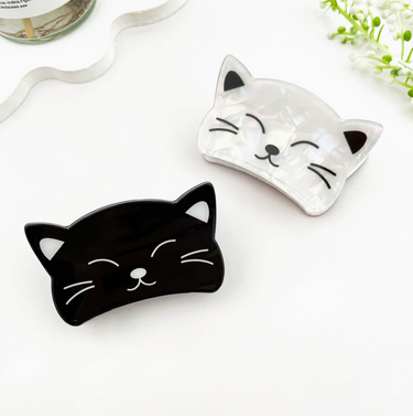 One clip features a stunning pearly white iridescent finish that catches the light with every turn, while the other is a sleek, classic obsidian black. Both feature adorable minimalist faces with closed eyes and whiskers—because even your hair accessories should be this relaxed.