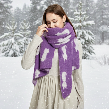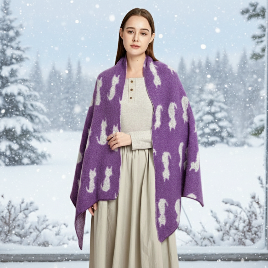 Our Soft Wool Cat Scarf is the purrfect blend of warmth, softness, and adorable charm. Designed in a rich purple hue and patterned with playful white cat silhouettes, this statement accessory keeps you snug while showing off your love for all things feline.