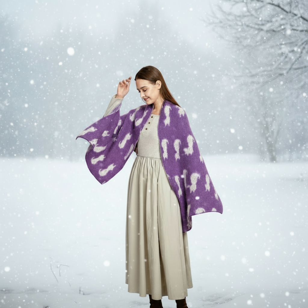 Made from a premium 30% wool / 70% acrylic blend, it offers the ideal balance of softness, durability, and comfort—never itchy, always cozy. Oversized and lightweight, it drapes beautifully over your shoulders, layers effortlessly with coats, and doubles as a warm wrap for travel or chilly days.