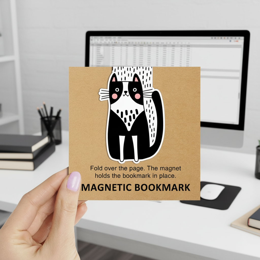 Paired with the journal is a matching magnetic bookmark featuring one of the stylish black-and-white cats from the cover. The fold-over magnetic design clips neatly onto the page and stays put, making it perfect for books, planners, and journals without bending or damaging pages.