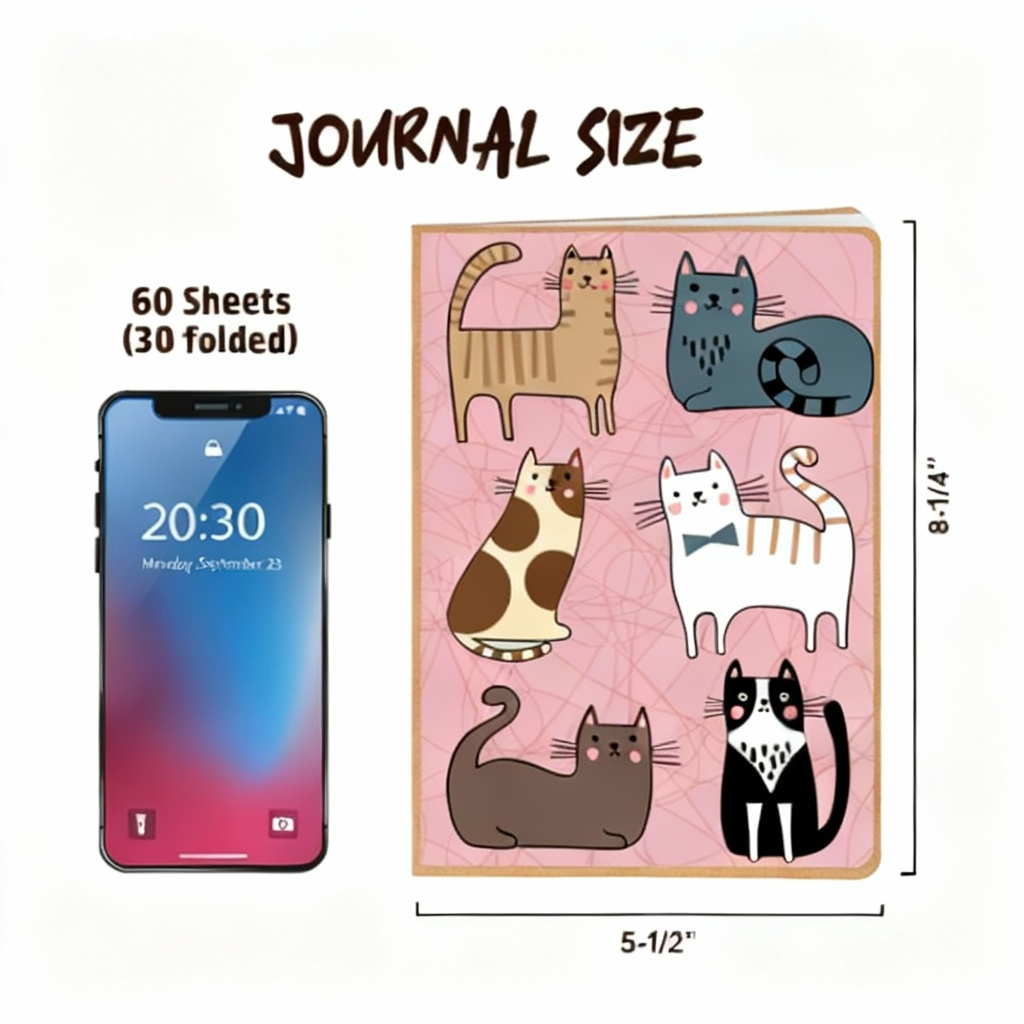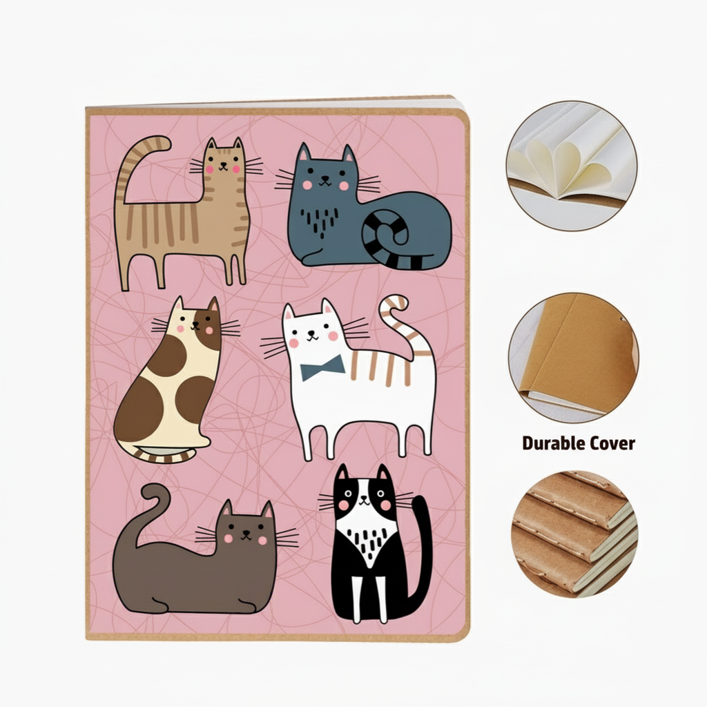 The A5 journal (5.5" x 8.25") features a playful pink cover decorated with a variety of cute illustrated cats—perfect for brightening someone’s day each time they reach for it. With 60 cream-colored pages and a tight-stitched binding, this journal is ideal for planning, list-making, writing, or sketching. Lightweight and compact, it fits easily into backpacks, handbags, or work totes for everyday use.