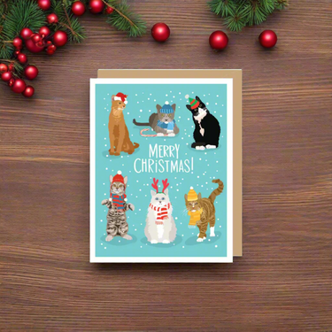 Send warm wishes with a touch of whiskers this holiday season! Our Holiday Cats Christmas Card features six festive felines bundled up in scarves and hats, surrounded by snowflakes on a cheerful blue background. It's the purr-fect way to spread holiday cheer to fellow cat lovers.