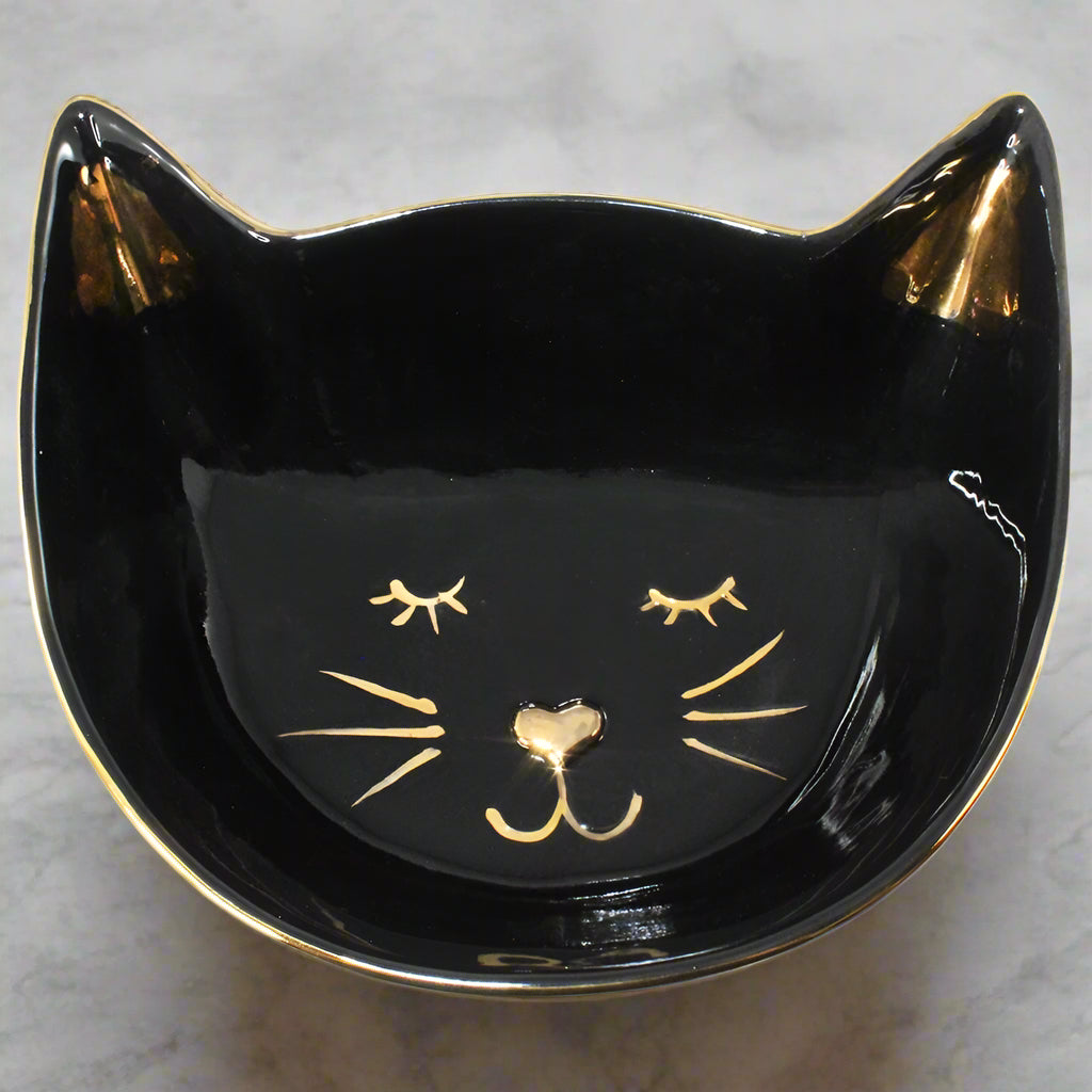 Add a touch of whimsical charm to your home with the Black Cat Bowl! This decorative bowl is shaped like a black cat's face, complete with gold-tone details highlighting a smiling cat face. Perfect for holding trinkets, jewelry, or even a handful of dry snacks like pretzels, this bowl is the ultimate addition to your cat-inspired décor.