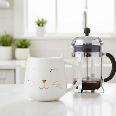 Start your day with a smile and a purr with our Cat Face Mug! This charming white mug, featuring delicate gold accents for the cat ears, whiskers, and nose, brings a touch of whimsy to your morning routine. It is just right for a cozy cup of coffee, tea, or hot chocolate, while the comfortable C-shaped handle makes every sip enjoyable.