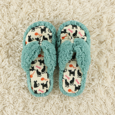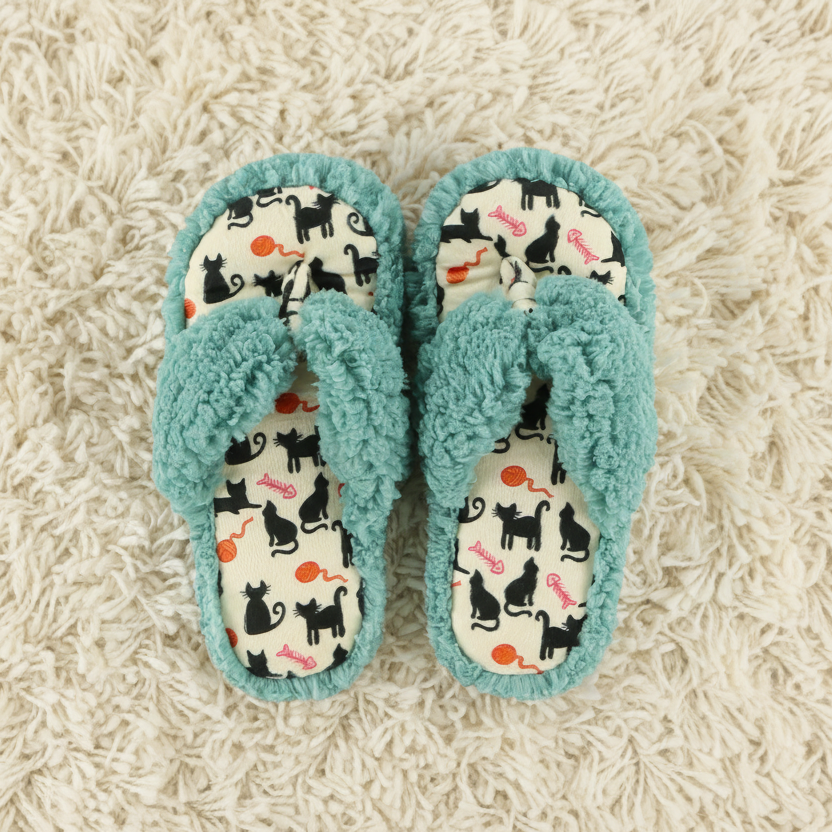 Treat your feet to a spa day at home with our Cat Nap Spa Slippers. These playful slippers combine the airy feel of a flip-flop with the plush warmth of your favorite house shoes. Featuring a charming pattern of black cats, yarn balls, and fish skeletons against a vibrant teal trim, they are the perfect companion for post-bath relaxation or a slow morning lounging with your cat.