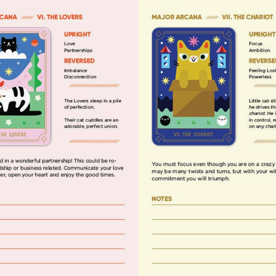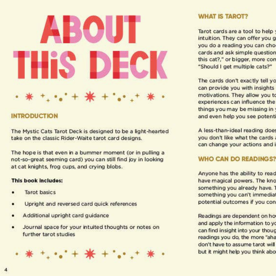 The Guidebook: A 96-page companion book (3.87 x 5.37 inches) to help you interpret the "Nine of Pentacles" (which is obviously catnip-related) and more.