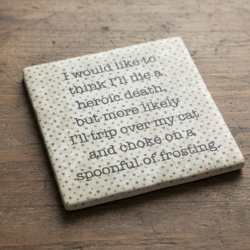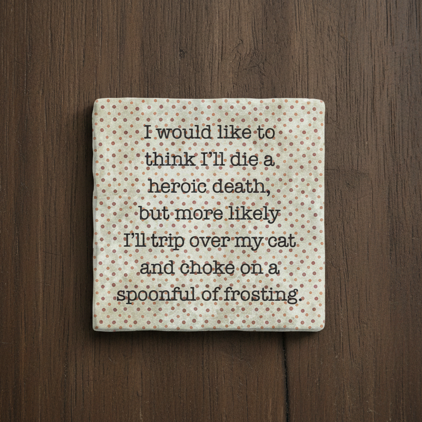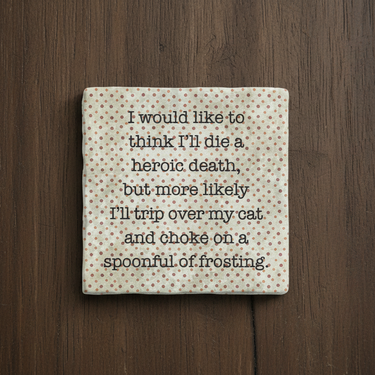 Celebrate the hilarious reality of cat ownership with our Heroic Death Cat Marble Coaster! Featuring the witty quote: "I would like to think I’ll die a heroic death, but more likely I’ll trip over my cat and choke on a spoonful of frosting," this coaster is a fun and catchy addition to any coffee table.