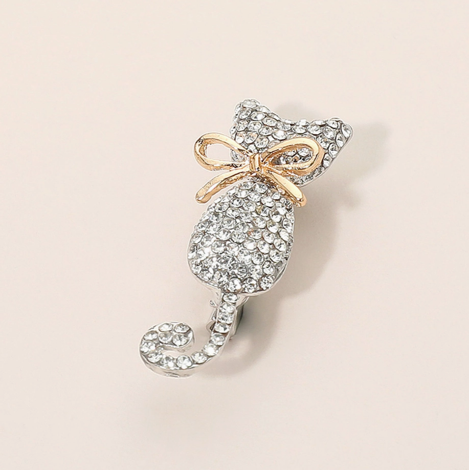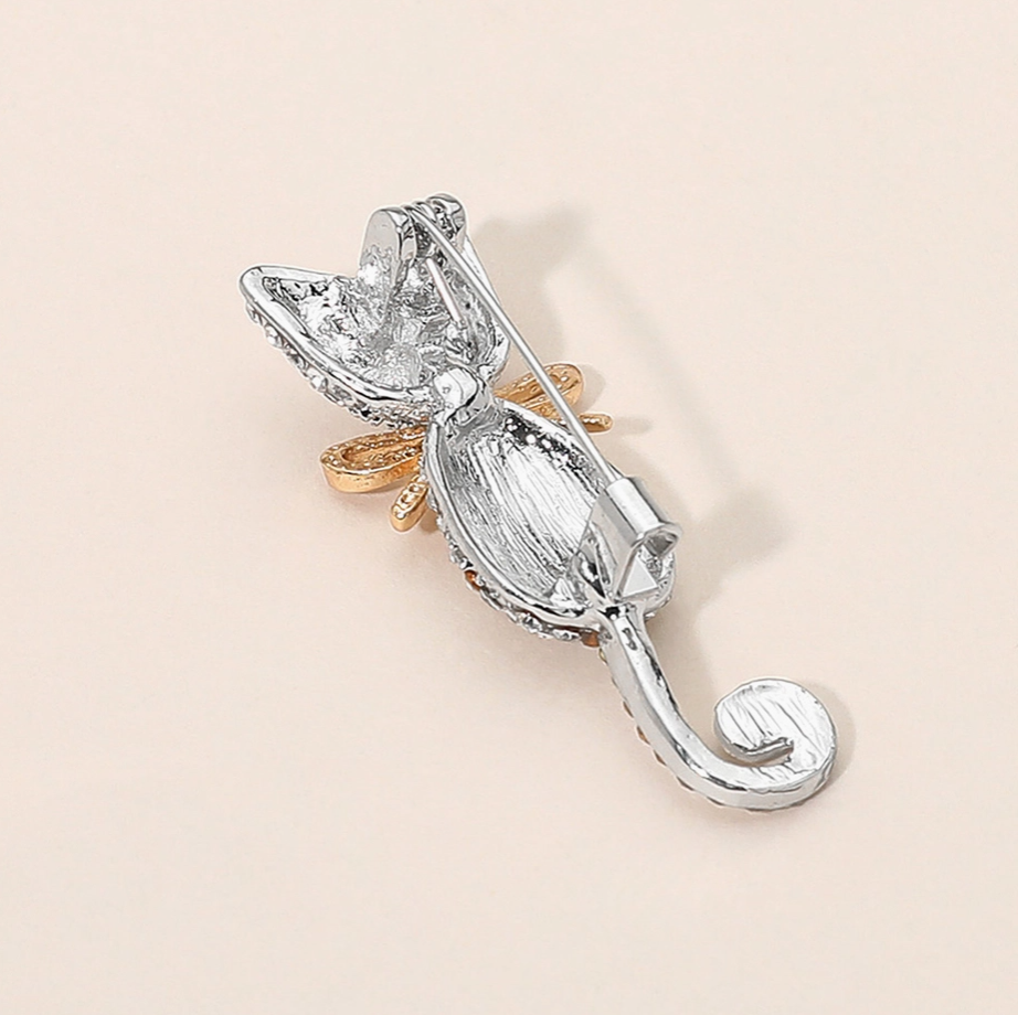 Add a dash of sparkle and feline elegance to your outfit with the Rhinestone Cat Brooch. This chic accessory features a beautifully sculpted cat silhouette encrusted with shimmering crystals and finished with a delicate golden bow.