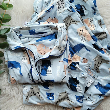 Feast your eyes on our fabulous feline fashion! 😺 Choose between the oh-so-adorable pink pair, decked out in black cat faces, or the dreamy blue version adorned with sleepy cats in pastel colors. It's like a cat nap for your legs!